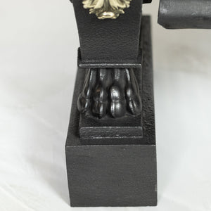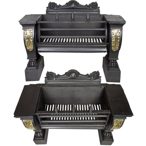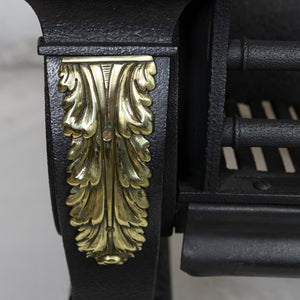 The steel and cast iron fire grate stands proud with scrolling square tapering pilaster, supports with acanthus headings and lion's paws on a plinth base. Each side has wonderful applied brass acanthus.