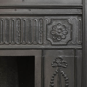 A large cast-iron Georgian register grate with finials and ornate apron.