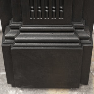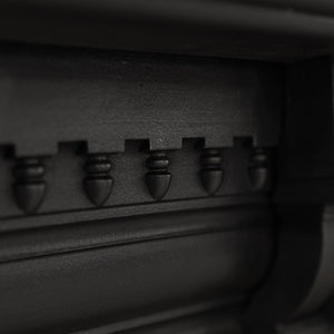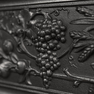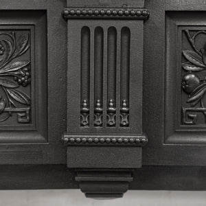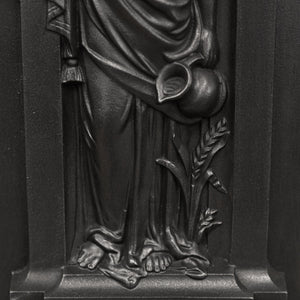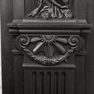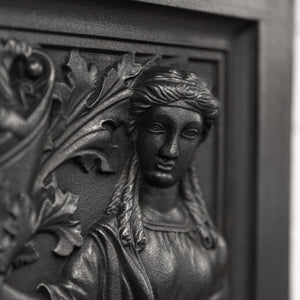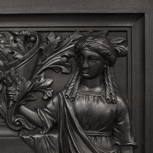 An outstanding cast iron fireplace features allegorical depictions of the Greek symbols for Peace (Eirene) and Plenty (Plutus), in the form of two Classically dressed women. 'Peace' is shown holding a dove and olive branches, whilst 'Plenty' is depicted with a cornucopia overflowing with flowers and fruit.