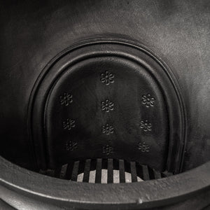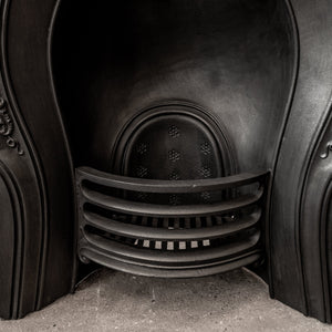 This original antique insert features a floral cast iron motif that adorns the circumference of the horseshoe. It also has a 4 bar integral basket with simple and charming floral backplate.