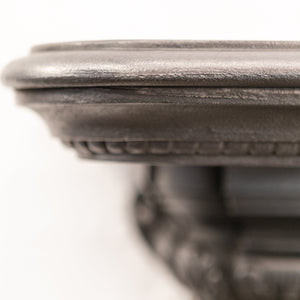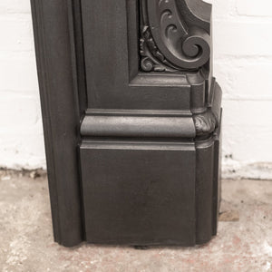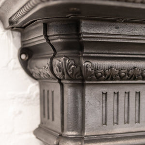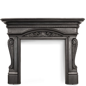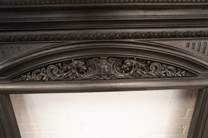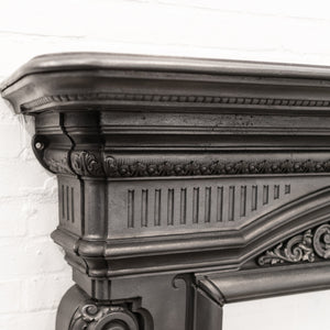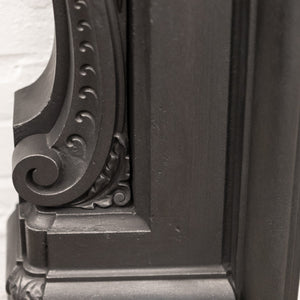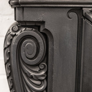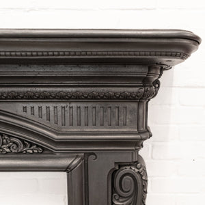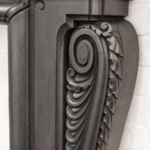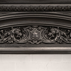 This original nineteenth-century chimneypiece is highly decorative with a central shield featuring mythical creatures, accompanied by scrolling leaves and florals. The jambs, with cascading scrolls and feathered detailing, surmount simple but stately block ends.