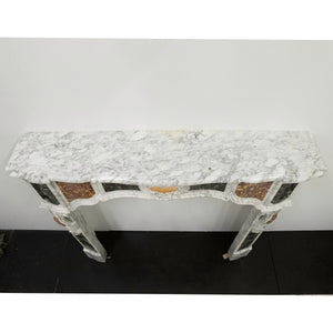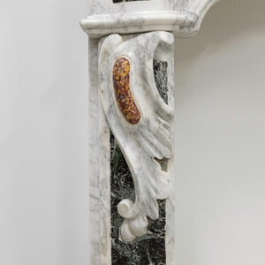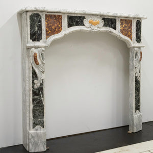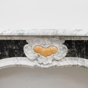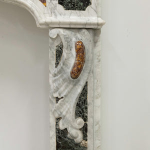 18th Century French Provençal Carrara Marble Fireplace with Brocatelle and dark Verde marble to frieze and jambs. Carved motif to centre of frieze.