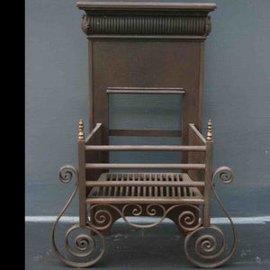 This original early twentieth-century basket has been decorated with attractive finials and elegantly curved legs, which contrasts well with the understated design of the fire back.