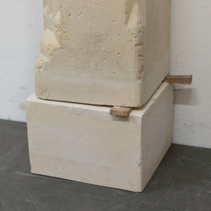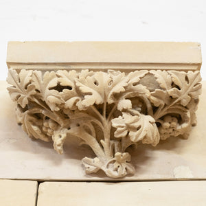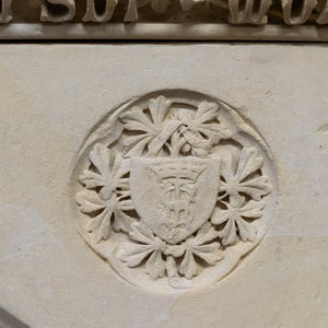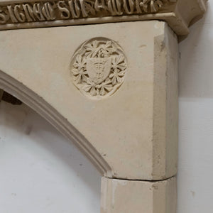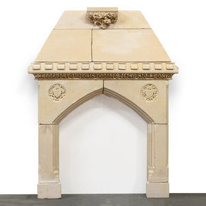 Of significant height, this magnificent period piece is composed of several blocks of pale honey-colour French stone that create a gothic arched opening. The chimneypiece is surmounted by central corbel with deeply carved florals.