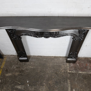 The serpentine break-frontshelf and opening teamed with the scrolling acanthus leaves and central seashell cartouche make this piece. This handsome piece has simple foot blocks supporting decorative jambs. The surround's feminine decorative panels are highlighted with foliate motifs.