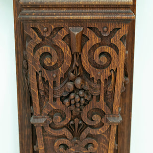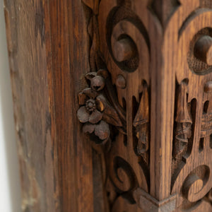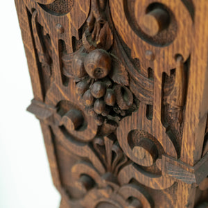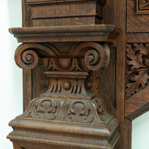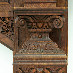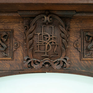 An impressive example of late 19th century craftsmanship, this the Arts and Crafts chimneypiece is hand-carved from richly toned oak, it features deep-profile ornamentation throughout, including scrolling foliage, classical motifs, and intricate monograms at the centre and end.