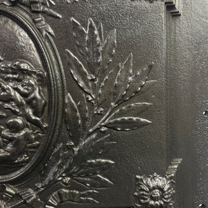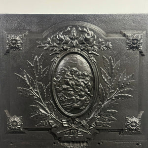 This exquisite cast iron fire back plate is a perfect blend of beauty and functionality, enhancing the visual appeal of your fireplace while efficiently reflecting heat into your living space. Adorned with intricate designs of florals, ribbons, and fire torches, it offers a sophisticated touch that seamlessly complements both modern and traditional aesthetics