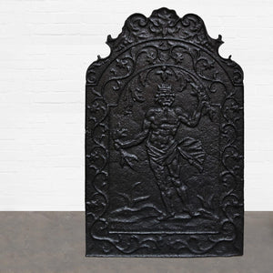 Decorative spiral foliage frames what we believe to be Poseidon; God of the Sea and other waters; of earthquakes; and of horses.
