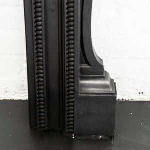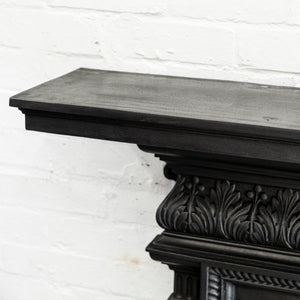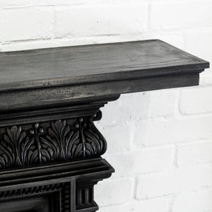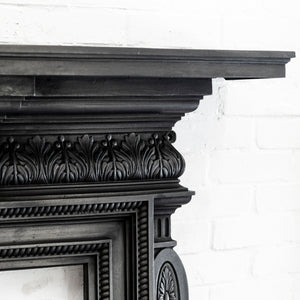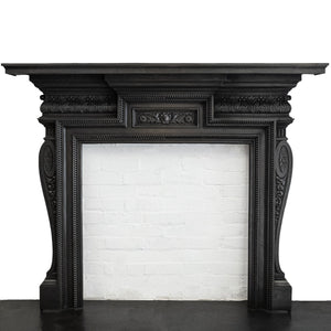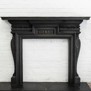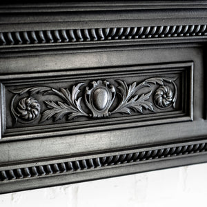 Antique cast iron fireplace surround with decorative floral motifs.