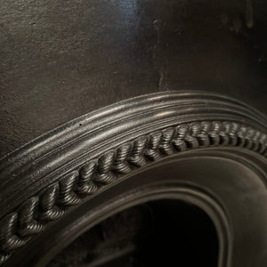 The basket has a subtle bow-front with columns running across the basket's width. Below the basket sits a decorative apron. The piece is flanked by wrought iron scrolls and curls. The front of the basket stands proud on column feet whilst the rear rests on the backplate.