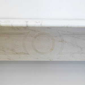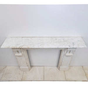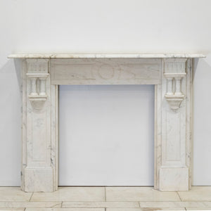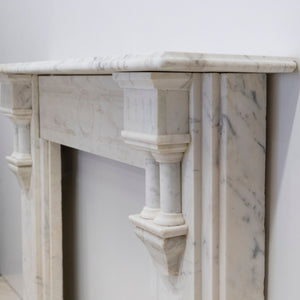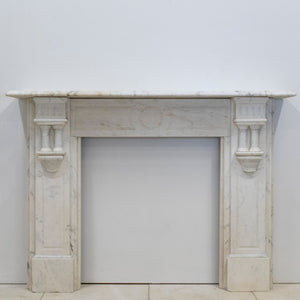 Executed in Italian Carrara marble this antique fireplace surround reflects late 19th-century Neoclassical influence, distinguished by its symmetrical form, linear proportions. Fluted pilasters on either side, each with twin baluster-style columns supporting block capitals. The frieze is decorated with a central circular medallion, adding symmetry and balance.