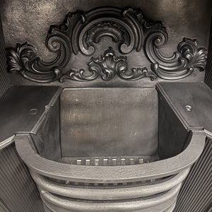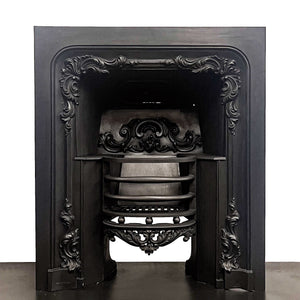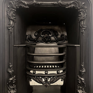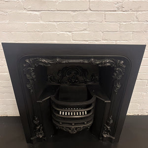 The insert is embellished with cast iron floral motifs on both the inner and outer elements of the insert. The iconic design of the period is echoed throughout the piece including the backplate and the 3-bar integral basket.