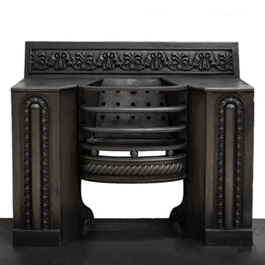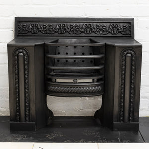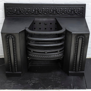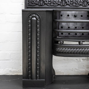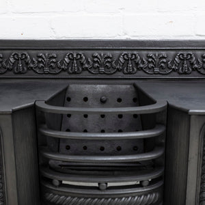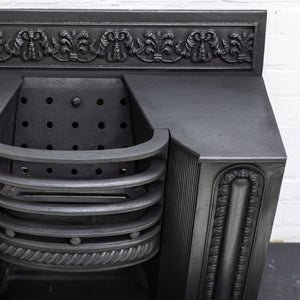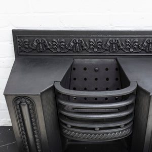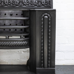 A fine antique Georgian hob grate in cast iron. This stunning and original hob grate benefits from decorative panelled sides as well as a deep profile floral and foliate cast decoration to the back plate.