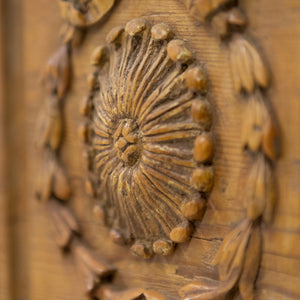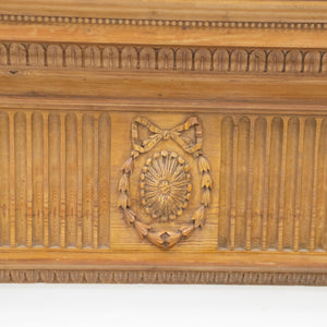 The frieze is carved with tightly spaced fluting, centred and flanked by applied oval paterae framed with laurel wreaths and ribbon ties.