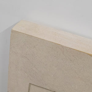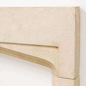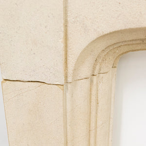 The antique piece has been hand-carved from solid Bath stone, delivering a warm tone. The reclaimed fireplace features an arched opening with inner mouldings, clean lines and chamfered-edged jambs.