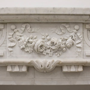 The elegant fireplace showcases exquisite detailing, such as the inverse breakfront shelf and beaded panelled frieze, with deep rose garlands and trailing ribbon carvings. The console jambs are surmounted by carved patera to the end blocks, with a continuous ornamental pattern descending the jambs.Adding a touch of sophistication and charm to any space in which it is placed.