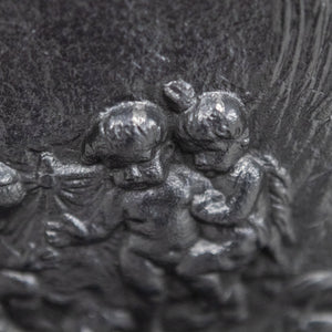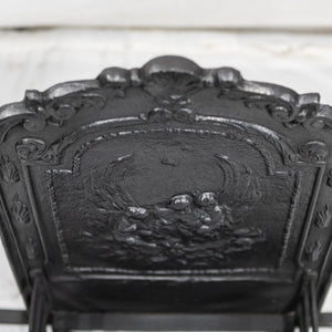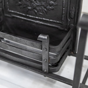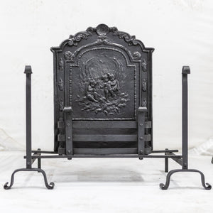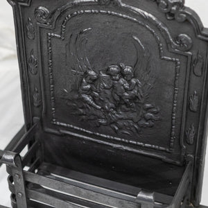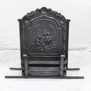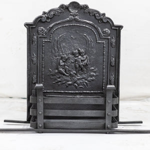 This attractive set is comprised of a removable iron grate and wrought iron andirons. The basket has a decorative back depicting a scene of cherubs framed by florals.