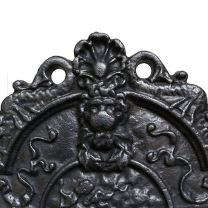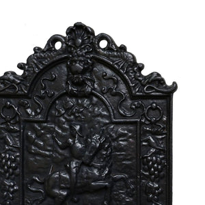 Antique reclaimed cast iron fireback with varied levels of relief work. Decorative low relief foliage frames a horse and rider with flag; suggestive of the imagery associated with the reign of Richard Lion Heart.