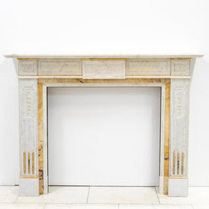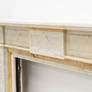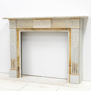 A refined victorian marble fireplace surround of elegant neoclassical design, executed in white statuary marble with vivid Siena marble inlays.