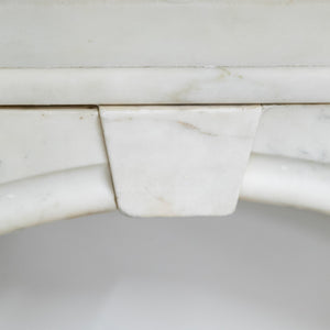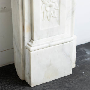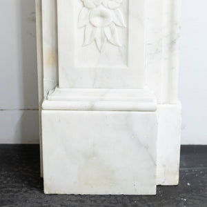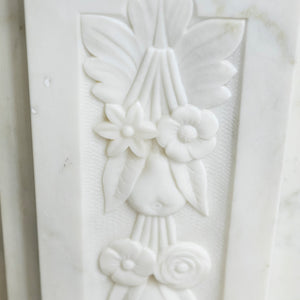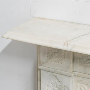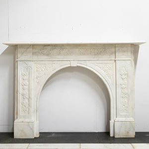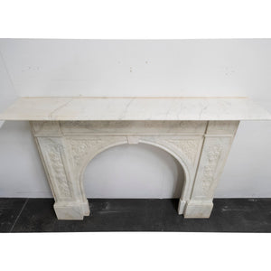 A substantial and striking antique fireplace surround with ornate carvings and crafted from statuary marble.