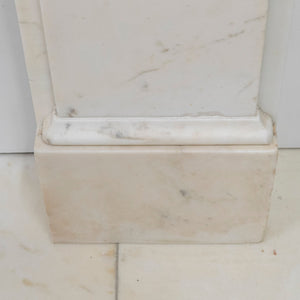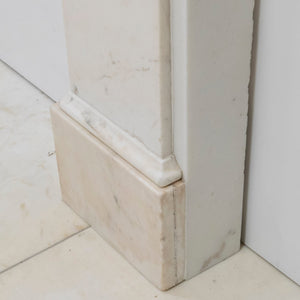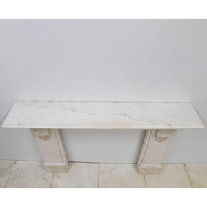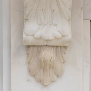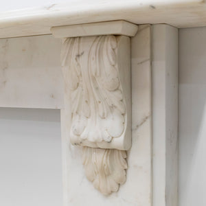 This refined early Victorian chimneypiece, crafted from fine Italian Carrara marble, showcases intricately carved corbels with foliage motifs, a large bevelled shelf rests atop.