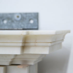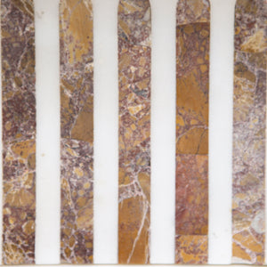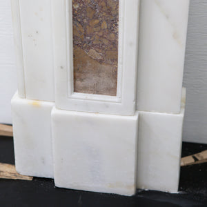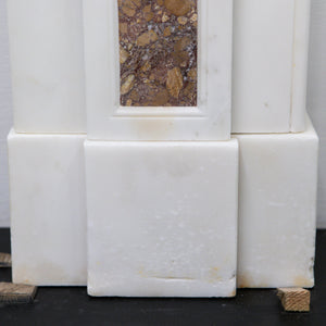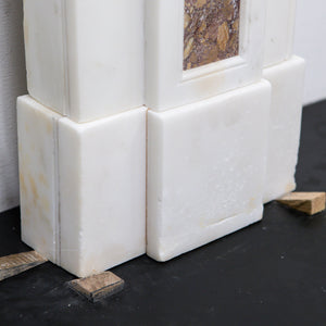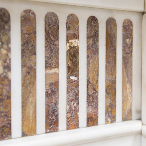 The breakfront shelf rests above an opulent frieze that is decorated with thumbnail Brocatelle marble. The frieze is flanked by end blocks carved with urns. Stepped jambs rest raised and stepped footblocks.