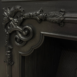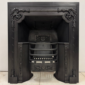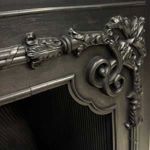 A finely crafted Georgian register grate featuring beautifully moulded panels with fluted pilasters, each adorned with intricate classical motifs. The upper corners are enriched with ornate scrollwork, adding depth and sophistication to the piece. Inside, the shaped fire opening houses a decorative integral basket with a ribbed backplate, crowned by a delicate foliate crest.