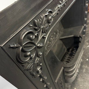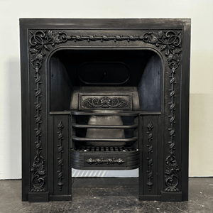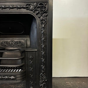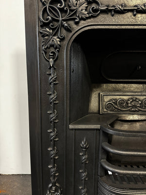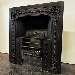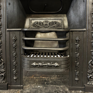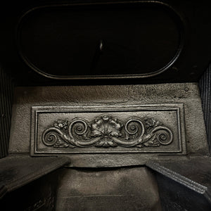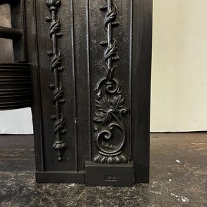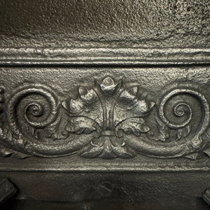 A smart and well balanced Georgian style register grate. This cast iron insert is an exquisite example of Georgian design adorned with floral motifs. The original fireplace insert showcases a decorative band of flowing foliates and florals, complemented by ornate detailing at the base of the basket.