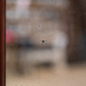 The large piece is flanked by fluted pillars and decorative motifs above the glass. The glass has exceptional patination acquired from age making this a particularly charming and unique piece.