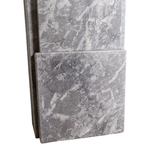A grand crossover surround made from grey marble reclaimed from the former New Scotland Yard on Broadway; A commercial modernist 20 floor tower constructed in 1967 from concrete, granite and steel.