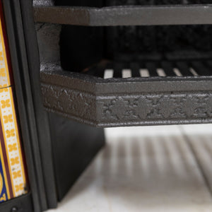 The side panels are adorned with original, vibrant Minton tiles in a repeating geometric and foliate motif. The insert comes complete with an integral 2-bar basket which can retain a gas fire module if required - Please contact us for more details.