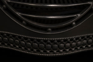 Openwork fretwork sits below the 4-bar integral basket. The piece is framed by a simple panel border with a central roundel.