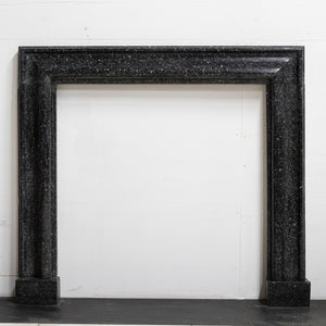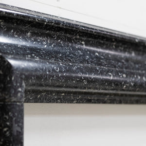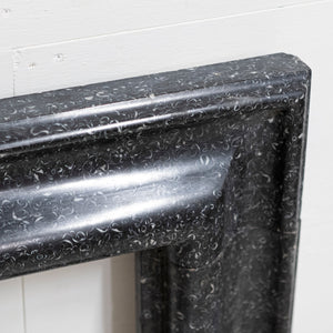 The handsome 18th-century fireplace surround is comprised of a simple bolection design that is complemented by the dramatic contrast that the Kilkenny marble delivers.