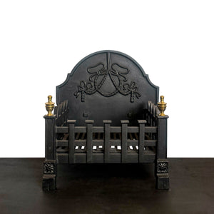 This victorian cast iron fire basket with brass finials showcases elegance throughout. The backplate is adorned with swags and bows, which are traditional deigns of the era. Above the feet, intricate floral motifs sit above them, enhancing the beauty and aesthetic to the piece.