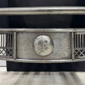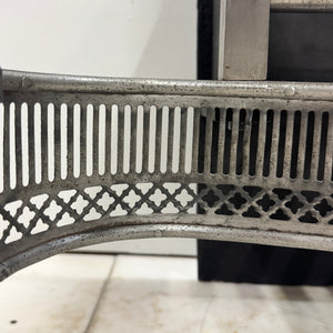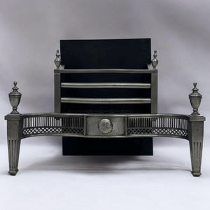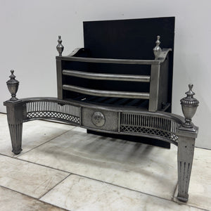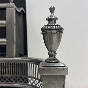A substantial polished steel and iron fire grate in the Georgian style. This elegant basket features a curved front, enriched with delicate latticework panels and a central sunburst medallion. The design is supported by tapered, fluted legs topped with classical urn finials.