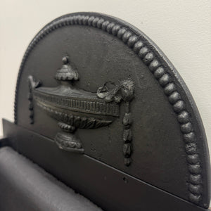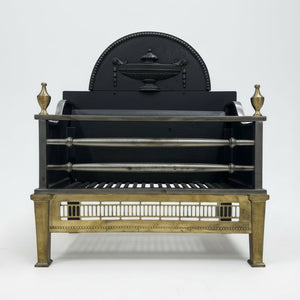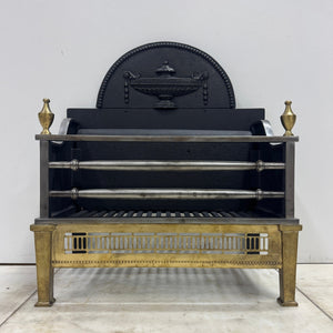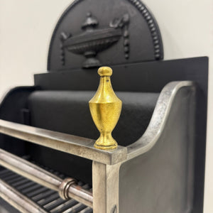 This regency style reclaimed fire basket features a beautifully balanced combination of polished steel, brass and cast iron. Showcasing the refined elegance typical of the Regency design. The basket is topped with decorative brass urn finials, adding a subtle touch of classical ornamentation.