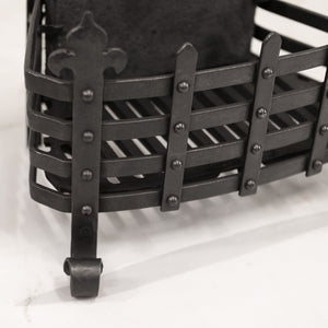 The simple piece has a subtle bow-fronted form comprised of railed posts in a lattice format, Each end post has a fleur-de-lis to the top and a curled scroll to the foot. The basket tapers in towards the back.