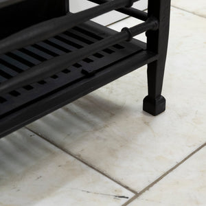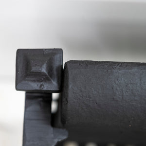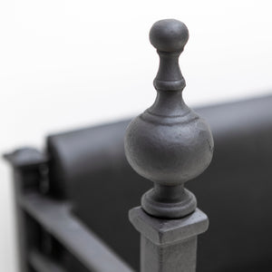 An elegant cast iron fire basket of restrained neoclassical influence, with twin turned front bars. The uprights are surmounted by finely shaped, baluster-form finials, providing a subtle decorative element.