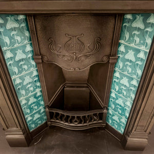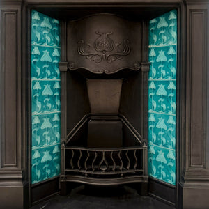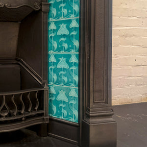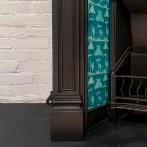 A beautiful Art Nouveau combination fireplace in cast iron with vibrant blue tulip tiles.