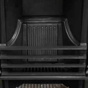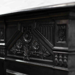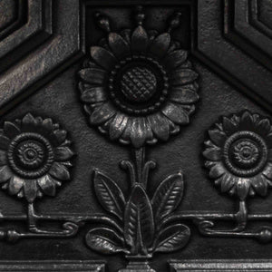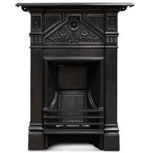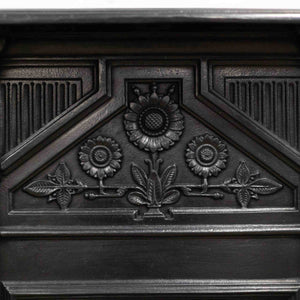 An antique cast iron combination fireplace featuring a triptych of daisy motifs above the hood, with an integral three-bar basket.