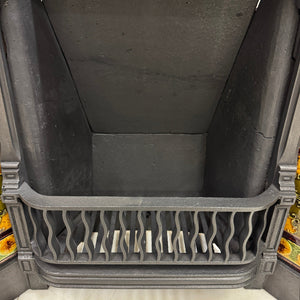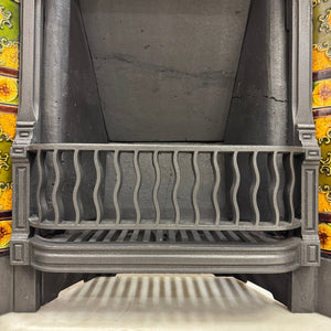 This cast iron combination fireplace showcases exquisite craftsmanship with its detailed design elements, including a charming dentil pattern beneath the shelf and elegant motifs of swags and leaves that enhance its aesthetic appeal. The intricate details of the fire complement the colourful tiles, making this a beautiful addition to any room.