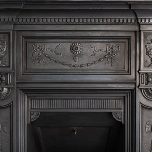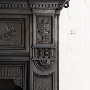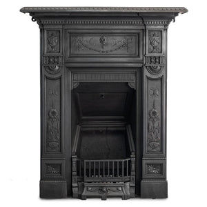 Fully restored in-house this original Cast Iron Combination Fireplace has ornate details of florals, urns, swags and bows.