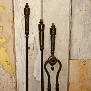 An antique cast iron fire iron fireplace companion set with decorative brass handles. The set consists of three pieces, including tongs, a shovel and a poker. The shovel face has been embellished with a particularly attractive decorative filagree motif. The three pieces have each acquired a lovely patina on the handles, which could be polished for a shinier finish if desired.