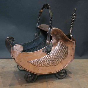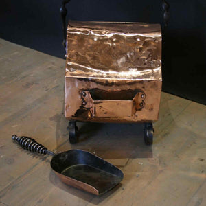 This piece is also adorned with ornamental wrought iron fittings, including an open twist handle on both the scuttle and on the handle of the copper shovel.
