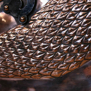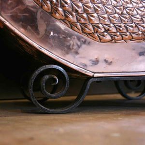 Both sides of this original and most unusual scuttle have been imprinted with a natural 'feathering' or foliate motif, typical of the Arts and Craft Movement.
