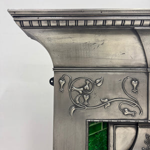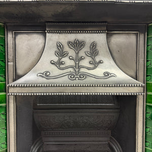 A stunning antique cast iron combination fireplace, richly decorated in the flowing, organic style of the Art Nouveau movement. The design features elegant tulip and vine motifs across the frieze and legs, centred by a delicate floral rosette.