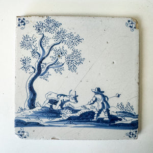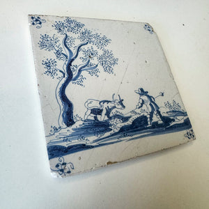 A set of two 18th century dutch delft tiles. Dutch Delft tiles are renowned for their intricate blue and white designs, these two tiles depict a man and cow surrounded by fields.