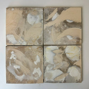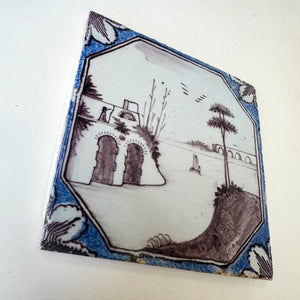 Four matching antique Dutch Delft tiles. Each tile depicts detailed landscape scenes with a combination of blue and manganese colouring. The corners of the tiles are decorated with a floral motifs surrounding the octagonal border.