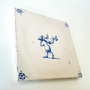 A set of six 18th century dutch delft tiles. The traditional blue and white designs, featuring children at play, are a classic representation of the Delft pottery style. Each tile is a miniature work of art, showcasing their intricate details and colours.