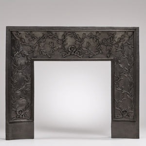 A handsome cast iron fireplace interior crafted from cast iron. The antique piece is designed to sit within the opening of a fireplace surround and frame the fire aperture just as slips would.
